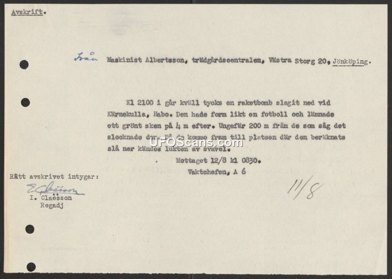 This document is a transcript of a report regarding an aerial sighting that occurred on the evening of August 11, 1952. The witness, a machinist named Albertsson from Jönköping, reported that at 21:00, a 'rocket bomb' appeared to crash near Kärnekulla, Habo. The object was described as being shaped like a football and left a green glow trailing behind it for approximately four meters. The object reportedly extinguished itself about 200 meters from the observers. Upon reaching the estimated impact site, the witnesses noted a distinct smell of sulfur. The report was received by the duty officer at A 6 on August 12 at 08:30 and certified as a true copy by I. Claesson.