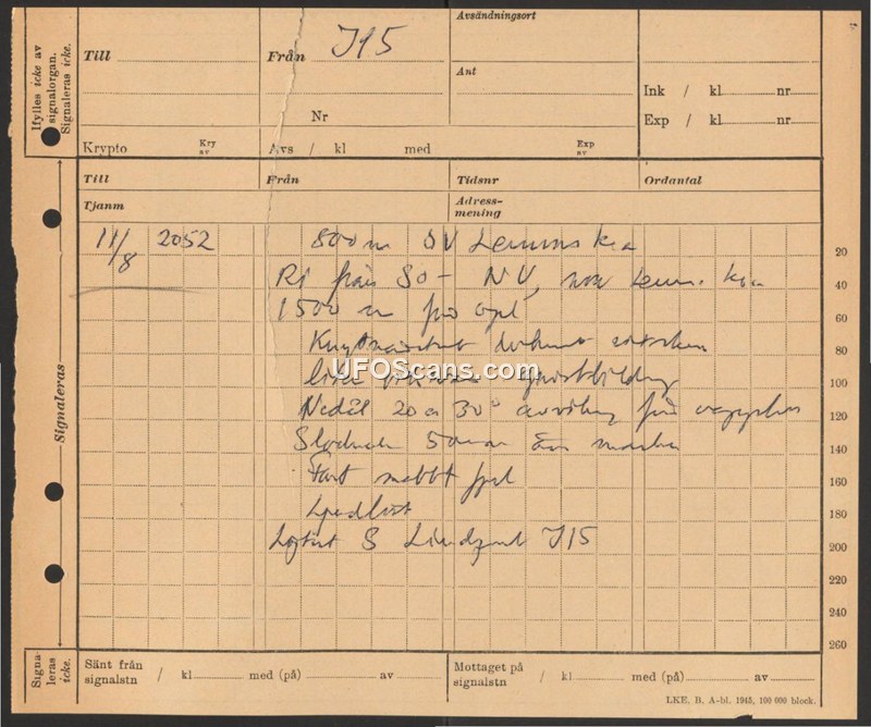 A military report from August 1945 describing a silent, fast-moving aerial object observed at 1500 meters altitude near Lemnaska, Sweden.