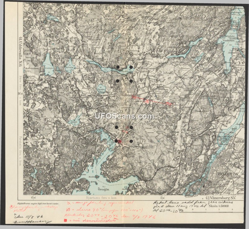 A field report by Everth Hauberg documenting a rocket sighting in Sweden on August 11, 1946. The report includes specific observational data and map annotations.