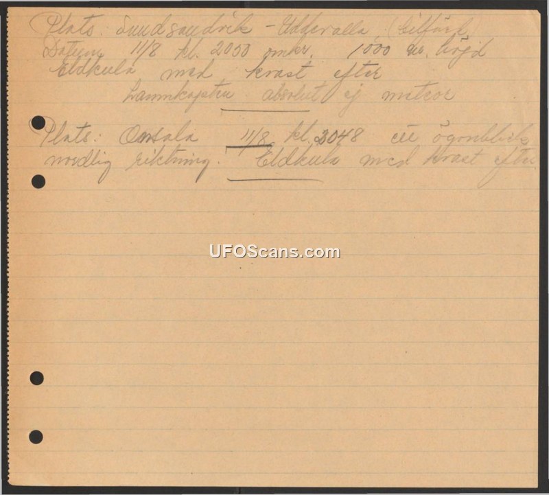 Handwritten notes documenting two fireball sightings in Sweden on August 11, both explicitly described as not being meteors.