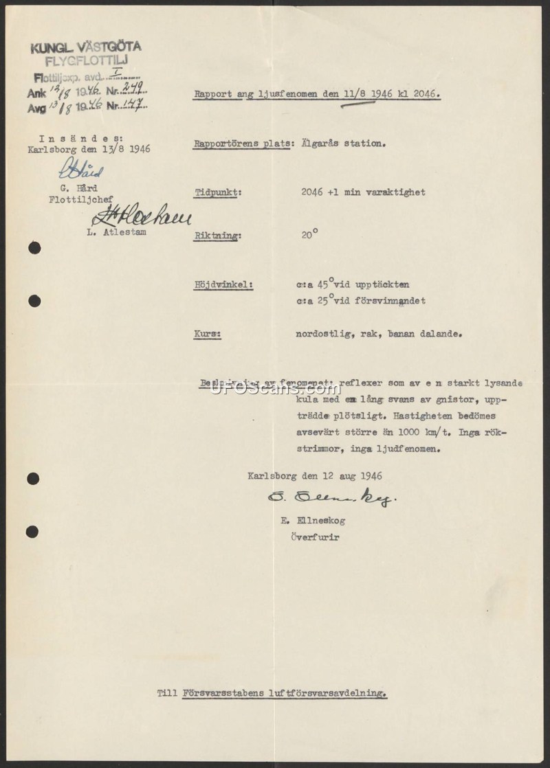 A 1946 Swedish military report detailing a high-speed, luminous spherical object with a spark-filled tail observed over Älgarås station. The object was noted for its lack of sound and smoke trails while traveling at speeds exceeding 1000 km/h.
