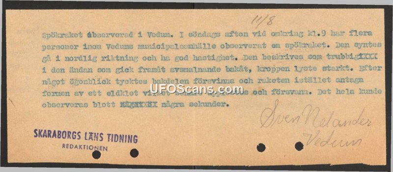 Ghost Rocket Sighting Report — Vedum, Sweden