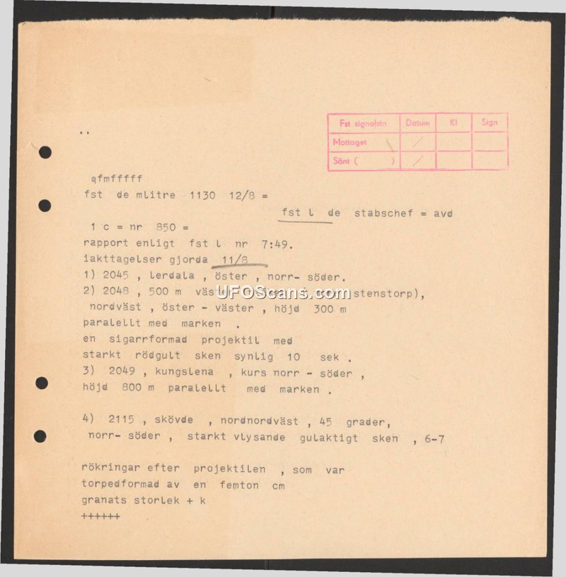 A Swedish military report from August 1948 documenting four separate sightings of unidentified aerial objects on August 11, 1948, in the Lerdala, Kungslena, and Skövde areas.