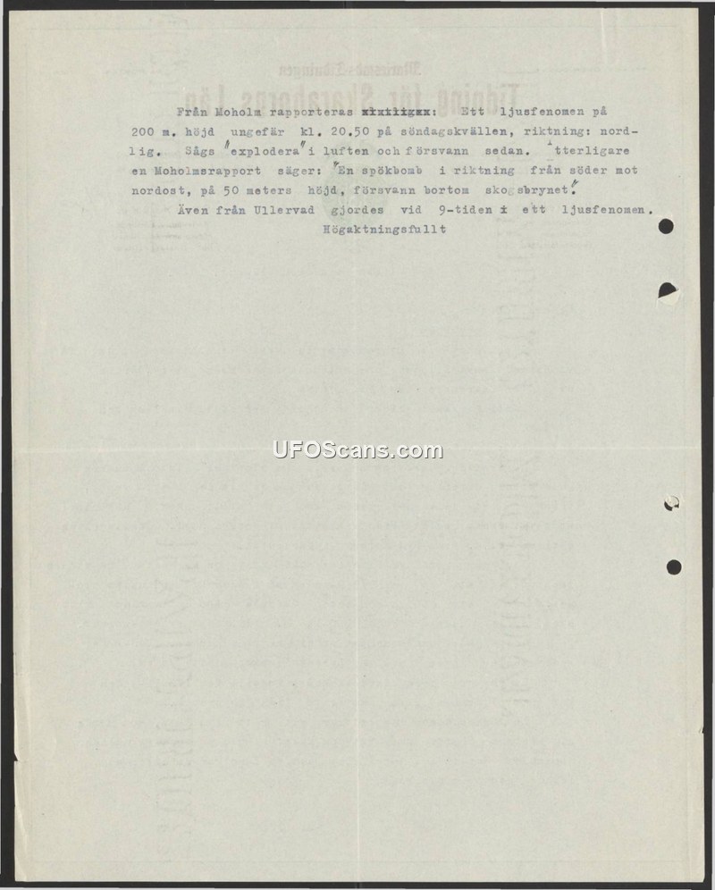 The document details multiple sightings of luminous aerial phenomena in the Swedish locations of Moholm and Ullervad on a Sunday evening. The reports describe objects at low altitudes, with one instance involving an aerial explosion.