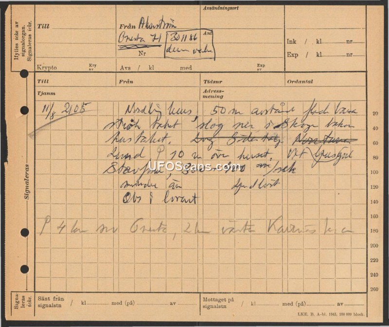 A report of an aerial object sighted near Onesta, Sweden, on August 11, 1986. The object was observed at low altitude with an estimated speed of 300-400 m/s.