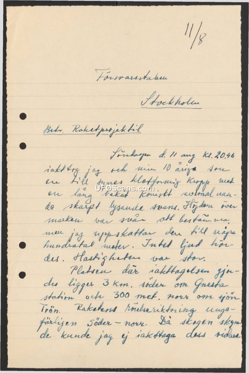 A report to the Swedish Defence Staff detailing a sighting of a spherical, high-speed object with a glowing tail on August 11, 1946, near Gnesta.