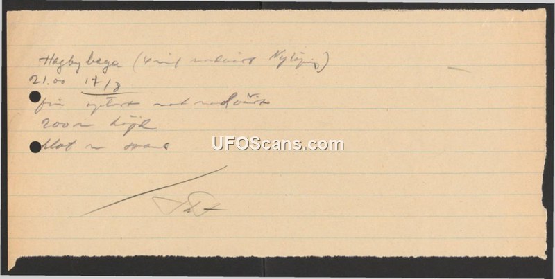 A brief handwritten note documenting a sighting at Hagbyberga on August 17th at 21:00, noting an altitude of 200 meters.
