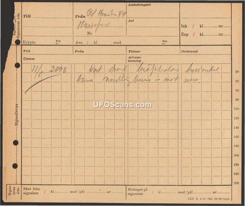 A 1945 Swedish military signal form referencing F11. The document is a standard communication template with minimal legible content.