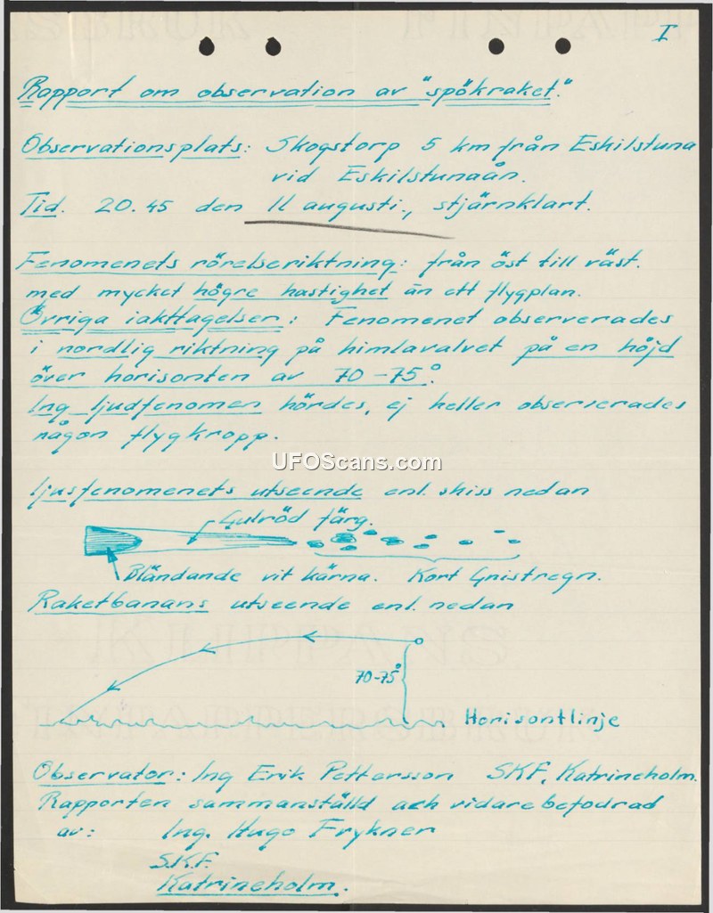 A report detailing a 1946 sighting of a 'ghost rocket' in Skogstorp, Sweden. The object was described as a high-speed, yellow-red light with a white core and a spark trail, moving east to west.
