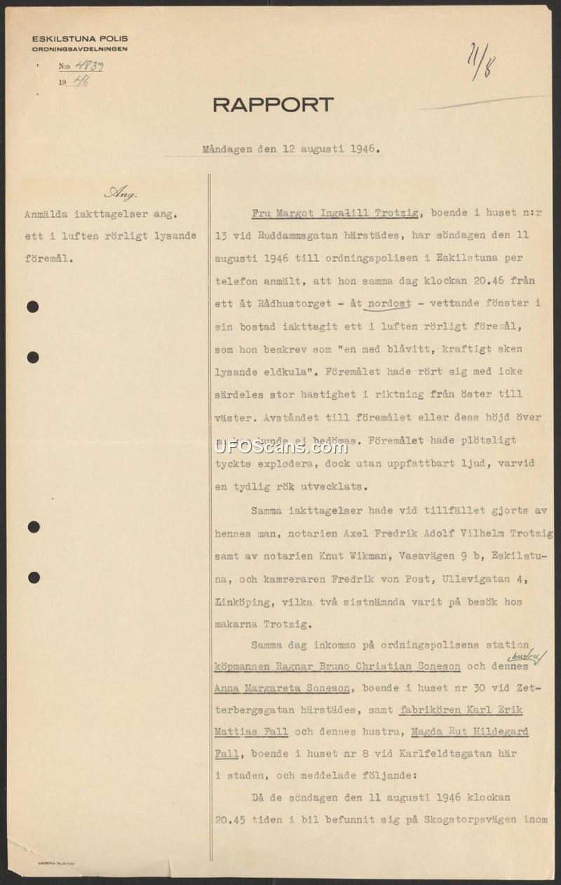 A police report from Eskilstuna, Sweden, details multiple witness accounts of a blue-white fireball observed on August 11, 1946. The object moved from east to west, appeared to explode silently, and left a smoke trail.