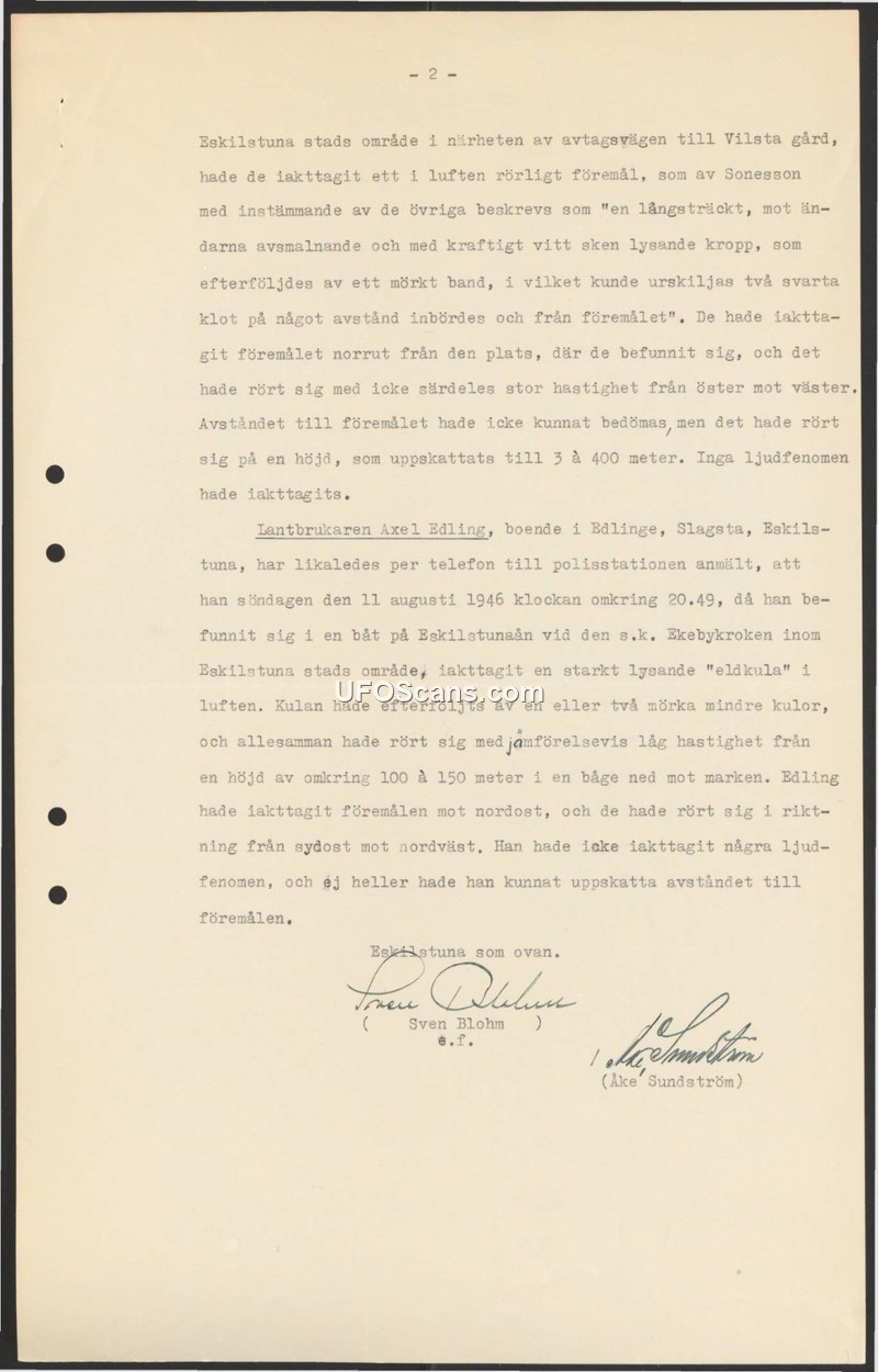 This document, originating from the Eskilstuna police, details two separate reports of unidentified aerial phenomena observed in the vicinity of Eskilstuna, Sweden. The first report describes an object observed by a group led by an individual named Sonesson. They described the object as an elongated body, tapering at the ends, emitting a powerful white light. This primary object was reportedly followed by a dark band containing two black spheres. The object was seen moving from east to west at an estimated altitude of 300 to 400 meters, with no associated sound. The second report was provided by a farmer, Axel Edling, who contacted the police station by telephone. Edling reported that on Sunday, August 11, 1946, at approximately 20:49, while he was in a boat on the Eskilstuna River near Ekebykroken, he observed a brightly glowing 'fireball' in the sky. He noted that this object was followed by one or two smaller dark spheres. The objects moved at a relatively low speed in an arc from a height of 100 to 150 meters down toward the ground, traveling from the southeast toward the northwest. Edling also reported that he heard no sound and could not estimate the distance to the objects. The document is signed by Sven Blohm and Åke Sundström.