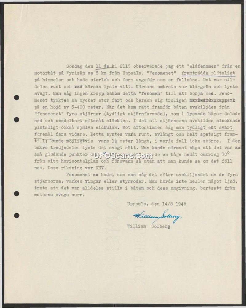 On August 11, 1946, at 21:15, William Solberg observed an unidentified aerial phenomenon while in a motorboat on the Fyrisån river, approximately 8 kilometers from Uppsala, Sweden. The object appeared suddenly in the sky, initially resembling a full moon in size and shape. It possessed a white, glowing core surrounded by a faintly glowing blue-green circumference. At this stage, no physical structure was visible behind the light. The object was estimated to be at an altitude of 300 to 400 meters and was traveling at a very high speed. As the object passed directly in front of the boat, it released four distinct, star-shaped objects that descended in glowing arcs before extinguishing. Immediately following this separation, the primary 'fireball' also extinguished. Against the evening sky, a dark, elongated, and pointed object became visible. Solberg estimated this object to be approximately 1.5 meters in length. The rear third of the object glowed with a faint red light, appearing as small glowing points. The object then performed a downward arc of approximately 30 degrees from its horizontal plane and disappeared. The witness noted that the object lacked wings or rudders and made no sound, despite the quiet environment, save for the faint hum of his boat's motor. The report was signed by William Solberg on August 14, 1946.