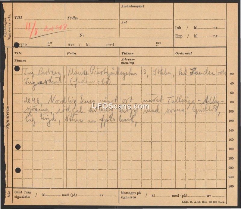 A 1945 Swedish signal form documenting a sighting report by a Fru Broberg near Tullinge at 20:48. The report mentions a northerly course.