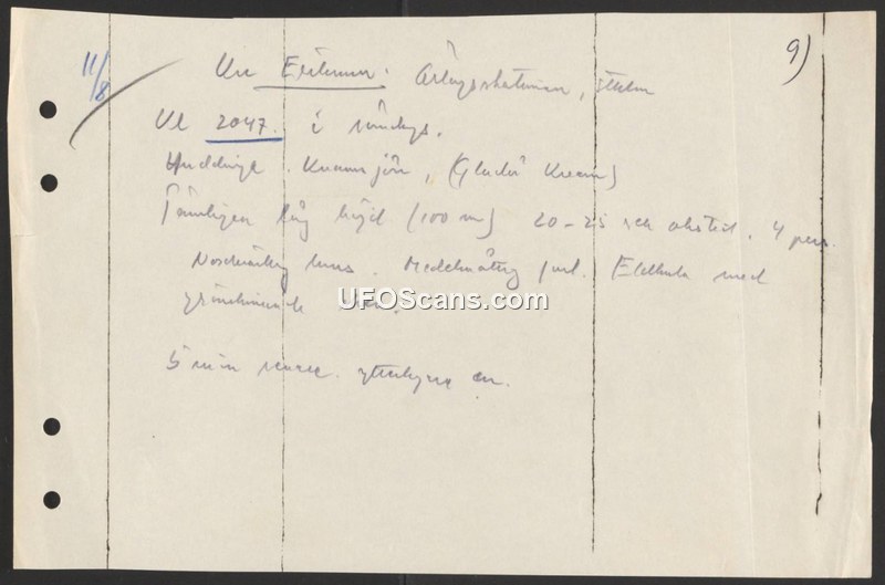 This handwritten document, identified by the reference number 2047, appears to be a brief field report regarding an aerial observation. The text, written in Swedish, notes a size estimate of 100 meters and mentions a duration of 5 minutes. Due to the significant degradation of the handwriting and the brevity of the notes, further specific details regarding the nature of the object or the circumstances of the observation cannot be determined.