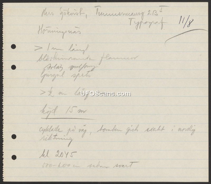 A handwritten report from August 11 regarding a sighting of an unidentified object in Hörningsnäs, Sweden. The object was described as having blue-shimmering flames, a pointed tip, and a tail, moving in a northerly direction at an altitude of 15 meters.