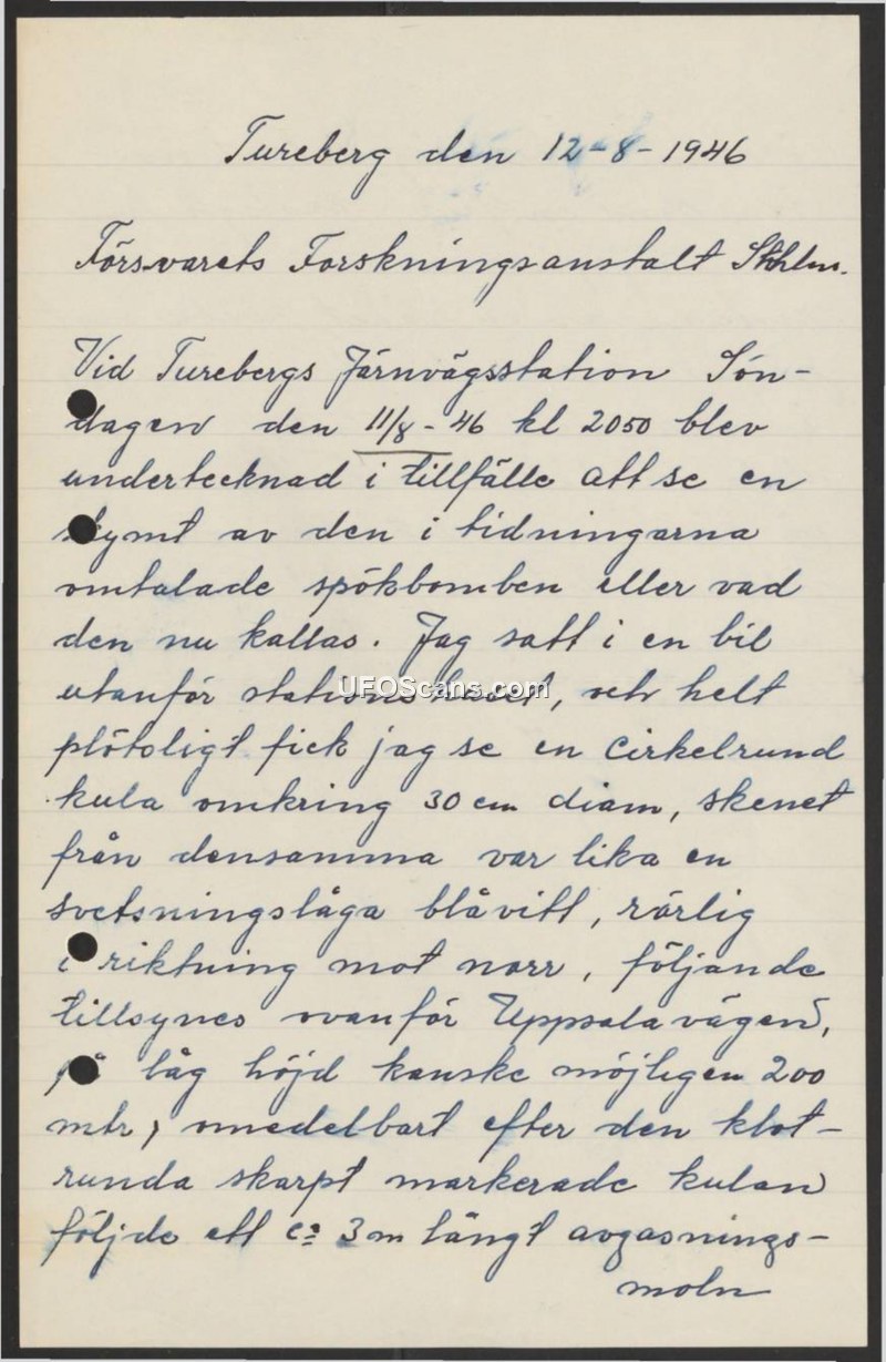 On August 12, 1946, an individual submitted a report to the Swedish National Defence Research Institute (Försvarets Forskningsanstalt) regarding a sighting that occurred on the evening of August 11, 1946. At 20:50, while sitting in a car outside the Tureberg railway station, the witness observed an object described as a circular sphere, approximately 30 centimeters in diameter. The object emitted a bluish-white light, likened to a welding flame. It was observed moving in a northerly direction at an altitude estimated to be around 200 meters, following the path of the Uppsala road. The object was noted to have a sharply defined appearance and left behind an exhaust cloud approximately three meters in length. The witness identified the object as being similar to the 'ghost bombs' (spökbomben) frequently discussed in the newspapers at the time.