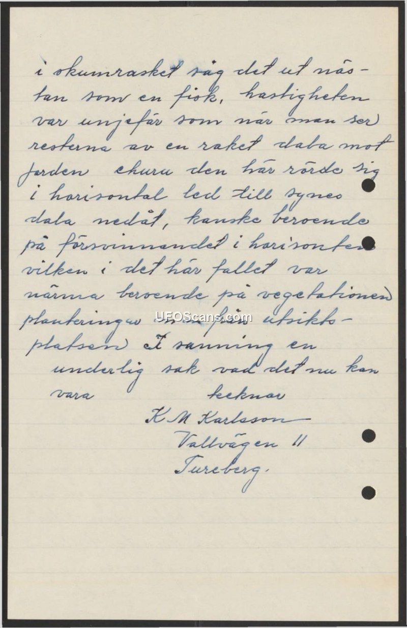 This document is a handwritten account by K.M. Karlsson, residing at Vallvägen 11 in Tureberg, describing an aerial sighting. The witness reports seeing an object in the twilight that appeared similar to a fish. The speed of the object was likened to the remains of a rocket falling toward the earth, although the witness noted that the object moved horizontally. The witness speculates that the perceived descent of the object might have been an illusion caused by it disappearing behind the horizon or local vegetation. The author concludes the note by describing the event as a strange occurrence.