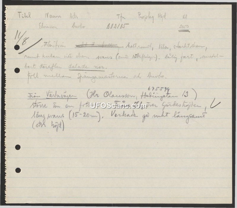 A handwritten report from August 11th documenting a sighting of a purple, round object with a long tail over the Duvbo area in Sweden. The object was observed moving slowly at high altitude.
