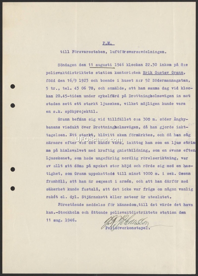 On August 11, 1946, at 22:30, Erik Gustav Grann, a clerk residing in Stockholm, reported a sighting to the 8th Police Guard District Station. Grann stated that earlier that day, at approximately 20:45, while cycling along Drottningholmsvägen toward the city, he observed a bright blue-white light in the sky. The object was located approximately 300 meters south of the Ängbybanan viaduct. Grann described the object as appearing like a light streak with heavy sparking, resembling a tail. He estimated the object was at a very high altitude and moving in a northerly direction at a speed of at least 1000 meters per second. Grann, who identified himself as a sergeant in the Swedish Army, asserted that his military background allowed him to confidently rule out common rockets, shooting stars, or meteors. The report was forwarded to the Defence Staff's Air Defence Department for their information.