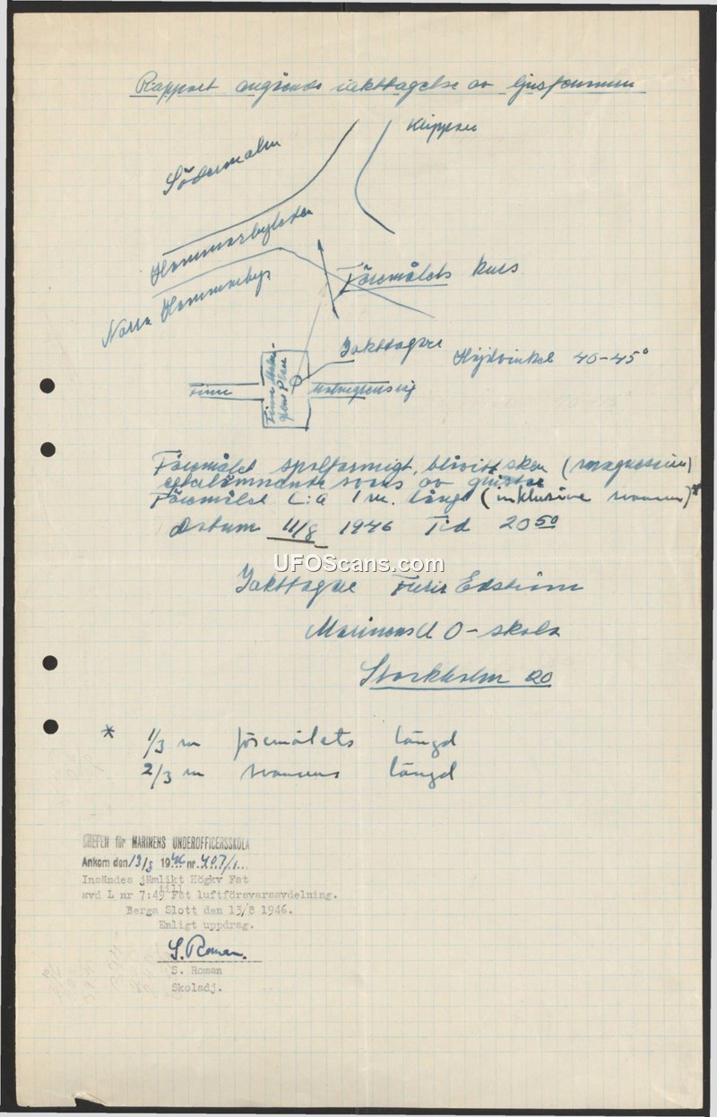 A 1946 Swedish Navy report documenting a sighting of a cigar-shaped, magnesium-colored light phenomenon observed at a 40-45 degree angle.