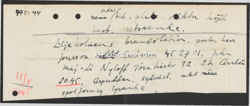 A handwritten report from May 11, 1945, documenting a luminous, spindle-shaped object observed moving southwest over Aspudden, Sweden.