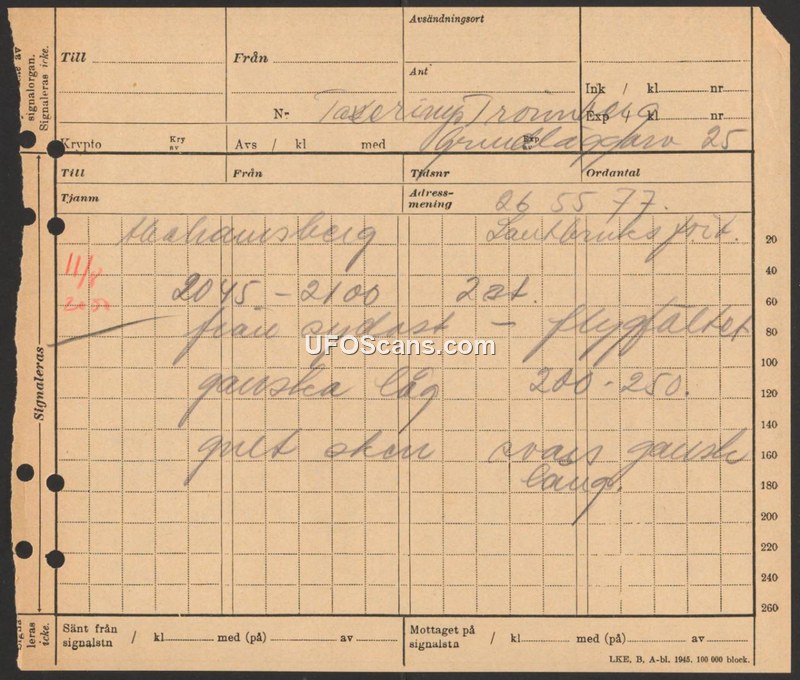 A 1945 Swedish report documenting the sighting of two yellow, low-altitude aerial objects near an airfield at Malmausberg.