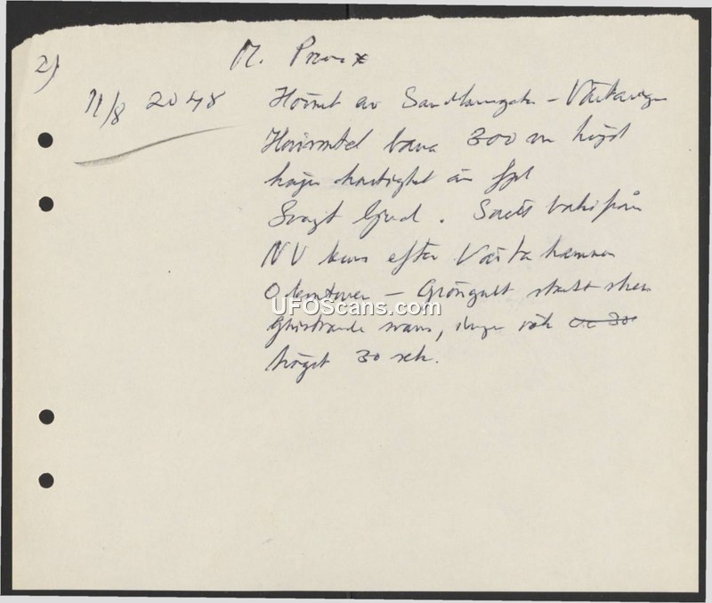 A handwritten report from August 11, 1948, details a 30-second sighting of a silent, greenish, high-speed object flying at 300 meters altitude over Västervik, Sweden.