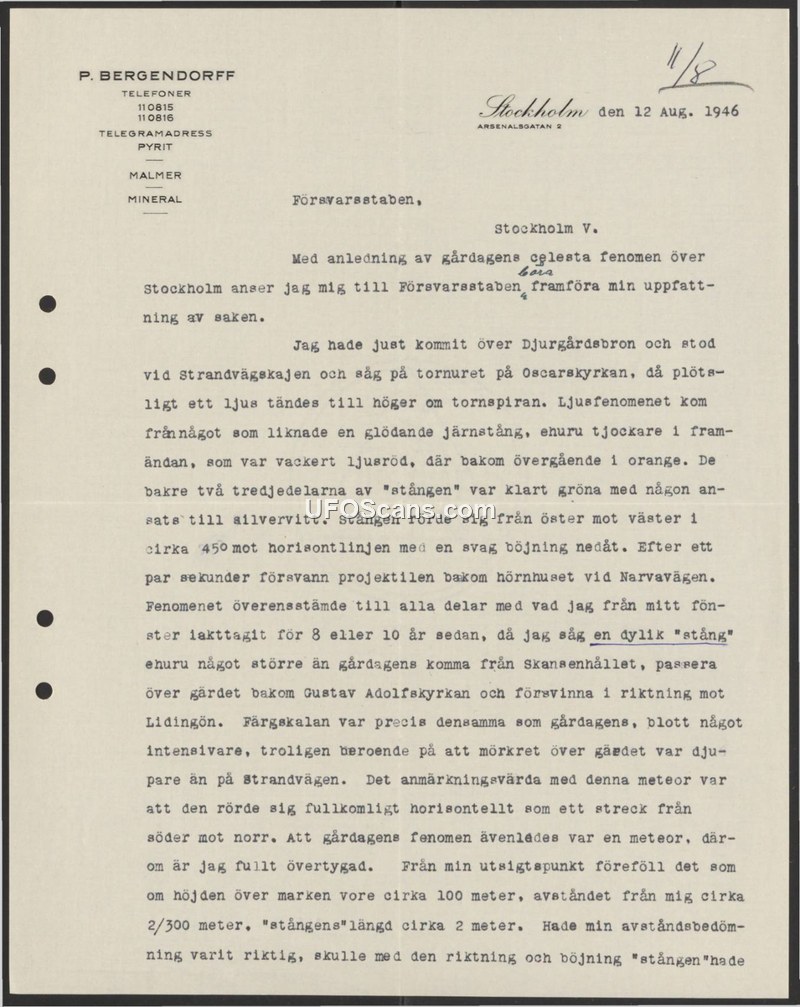 On August 12, 1946, P. Bergendorff wrote to the Swedish Defence Staff (Försvarsstaben) to report a celestial phenomenon he observed the previous day in Stockholm. While crossing the Djurgårdsbron and standing near the Strandvägskajen, Bergendorff observed a light appear near the spire of the Oscarskyrkan. He described the object as resembling a glowing iron bar, which was thicker at the front. The object displayed a color gradient, appearing light red at the front, transitioning to orange, while the rear two-thirds were bright green with a hint of silver-white. The object moved from east to west at an angle of approximately 45 degrees to the horizon, with a slight downward curve, before disappearing behind a building at Narvavägen. Bergendorff estimated the object's length to be about two meters, its altitude at 100 meters, and its distance from him at 200 to 300 meters. He noted that the phenomenon was similar to one he had observed 8 or 10 years prior, which had passed over the field behind Gustav Adolfskyrkan toward Lidingön. He expressed his firm conviction that the object observed on August 11 was a meteor.