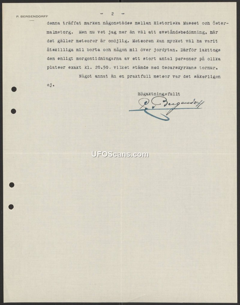 This document is a brief correspondence from P. Bergendorff regarding a celestial event observed in Stockholm. The author reflects on an initial impression that an object had struck the ground in the area between the Historical Museum and Östermalmstorg. Upon further reflection, the author asserts that estimating the distance of meteors is impossible, suggesting the object was likely several miles away and at an altitude of several miles above the earth's surface. The author notes that the event was reported by many people in the morning newspapers as occurring exactly at 20:50, a time that was corroborated by the clock tower at Oscarskyrkan. The author concludes with certainty that the phenomenon was nothing other than a magnificent meteor.