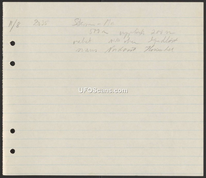 The document is a brief, handwritten note on lined paper. It contains a date (11/8) and a time (2035). The text appears to be in Swedish and includes a reference to an altitude of 500 meters. Due to the illegibility of the handwriting and the brevity of the content, no further context regarding the nature of the observation can be determined.