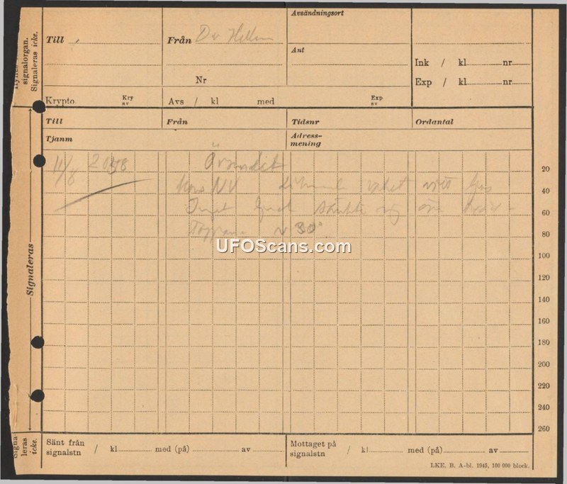 A brief, handwritten Swedish field report from August 11th at 20:48, authored by Dr. Hellen, noting an observation at a 30-degree angle.
