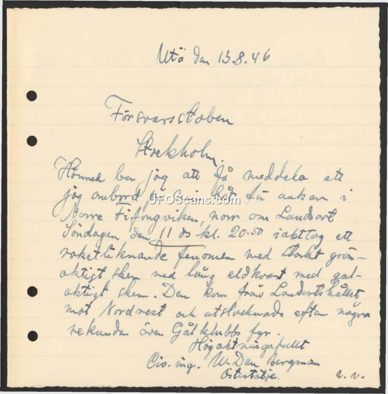 On August 13, 1946, a civil engineer named W. Dan Bergman wrote to the Swedish Defense Staff (Försvarsstaben) in Stockholm to report an aerial sighting. Bergman states that while on his boat in Tifongviken, near Landsort, on Sunday, August 11, 1946, at 20:50, he observed a rocket-like phenomenon. He describes the object as having a bright greenish color and a long tail of fire with a yellowish sheen. The object traveled from the direction of Landsort toward the northwest and extinguished after a few seconds, passing over the Gålklubb lighthouse.