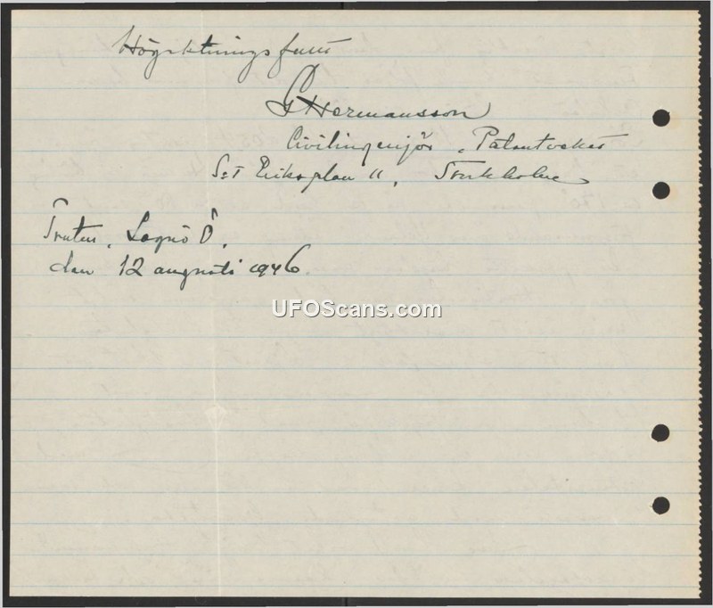 This is a 1946 letter from a Swedish civil engineer and patent attorney named G. Hermansson. The document contains no information regarding UAP or other historical incidents.