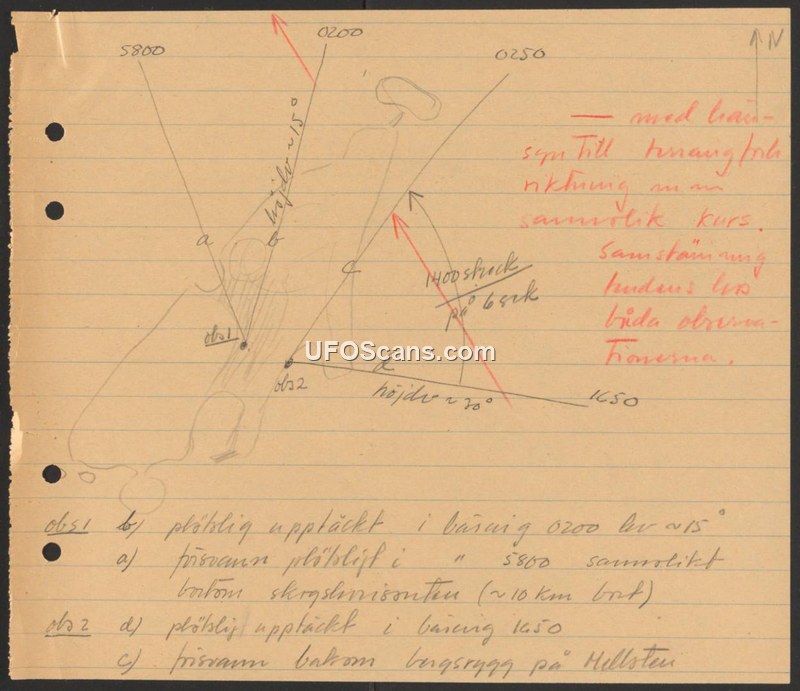 A hand-drawn sighting report from Sweden detailing observations of an unidentified object by two witnesses. The object was tracked across bearings until it disappeared behind a mountain ridge.