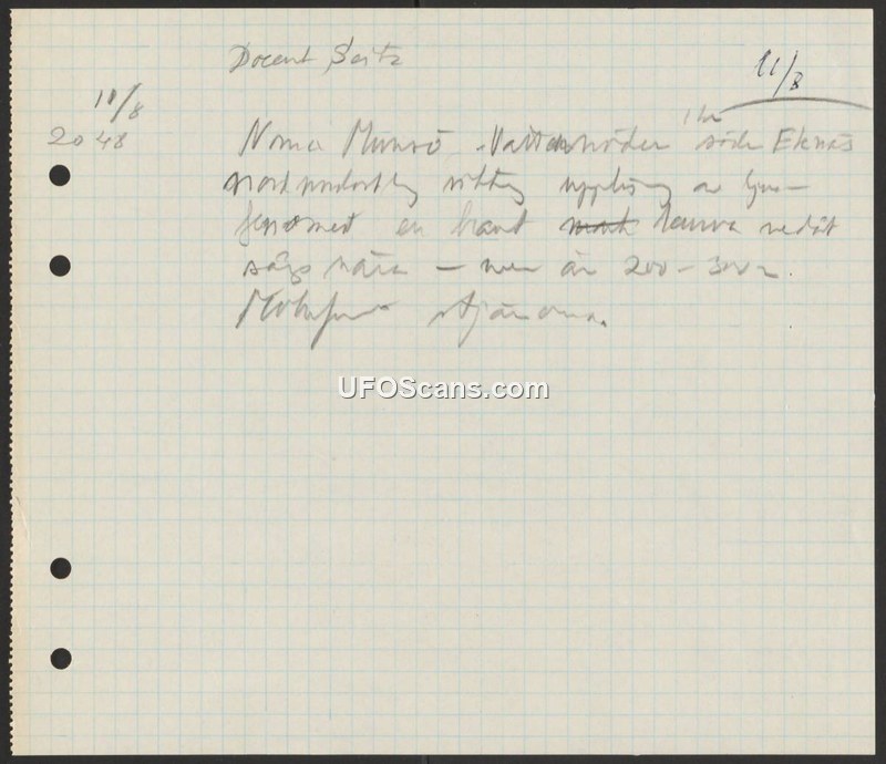 This document is a brief, handwritten note authored by Docent Seitz. It references a sighting reported by an individual named Noma Munro, located near Ekenäs. The text mentions a phenomenon and includes a reference to a distance or measurement of 200-300 meters. The note is dated 11/8 and contains a reference number or date of 10/8 2048 in the margin.
