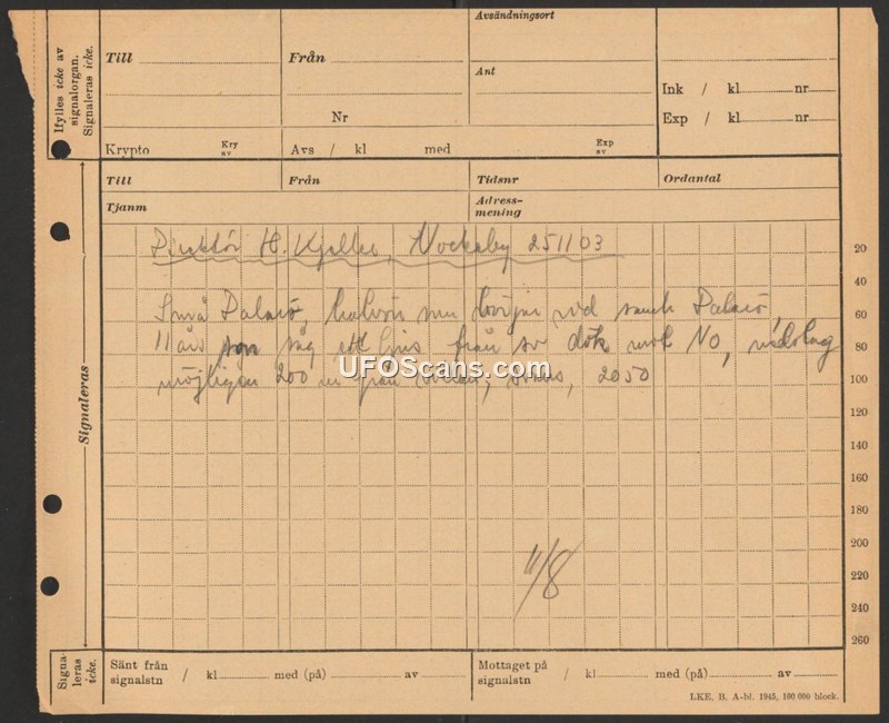 A brief 1903 message reporting a light observed in Nockeby, Sweden, at 20:50 hours. The light was described as appearing from the northeast at an estimated distance of 200 meters.