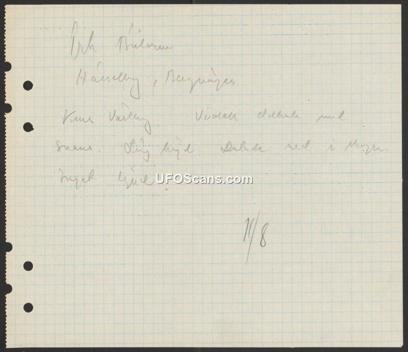 A handwritten report from Haresby, Bærum, describing a bright violet object descending into a forest. The document lacks metadata such as date or author.