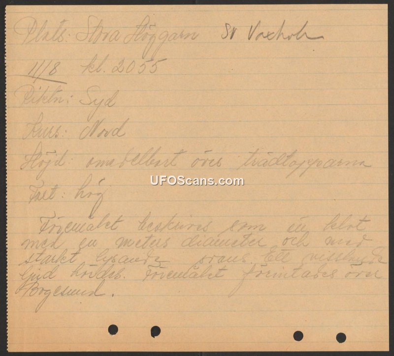 A handwritten report from Sweden describing a glowing, spherical object observed at high speed over Stora Höggarn on August 1st at 20:55. The object was estimated to be one meter in diameter and produced a whistling sound.