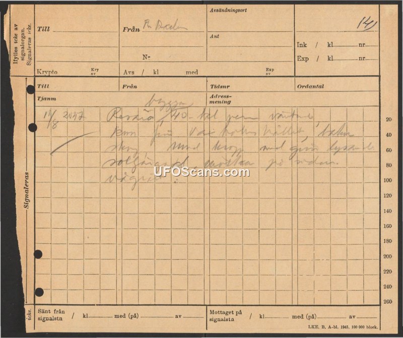 A Swedish military signal form reporting a sighting of a luminous object on August 1, 1947, at 20:47.
