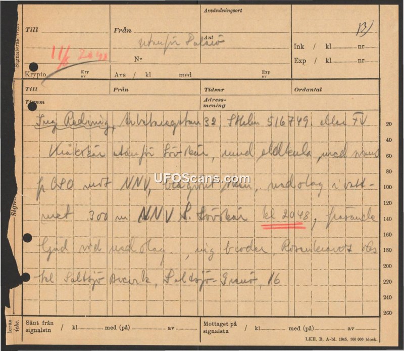 A telegram from 1945 reports a blue-green fireball sighting in Saltsjö-Boo, Sweden, at 20:48 on November 1st, traveling at 300 meters altitude with a roaring sound.