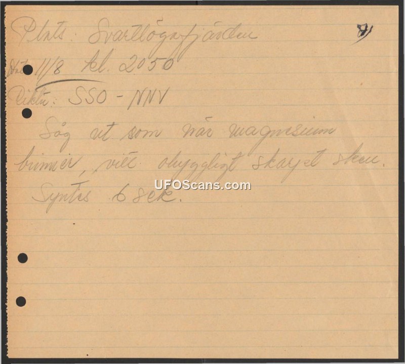 A short report detailing a six-second sighting of a bright, magnesium-like aerial object at Svartlögafjärden on August 11 at 20:50.