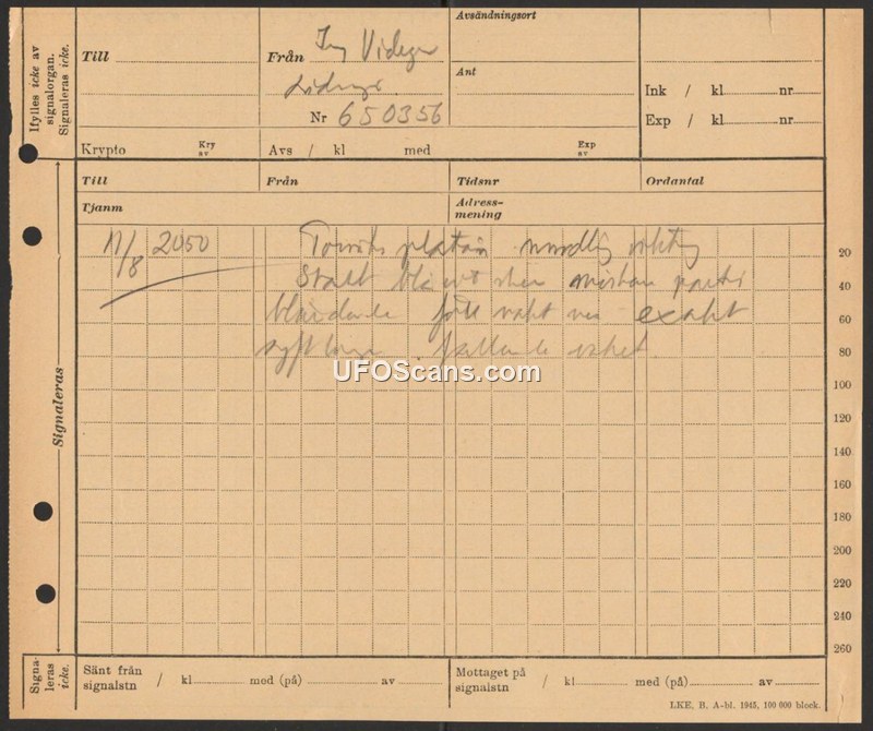 A Swedish military signal report from August 1, 1945, documenting an observation of an object moving north at 20:50 hours.