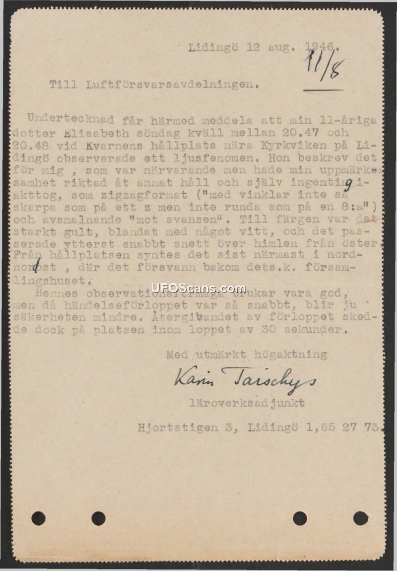 This document is a letter dated August 12, 1946, addressed to the Air Defense Department (Luftförsvarsavdelningen) by Karin Tarschy, a secondary school teacher (läroverksadjunkt). The author reports a sighting of an unidentified light phenomenon witnessed by her 11-year-old daughter, Elisabeth, on the evening of Sunday, August 11, 1946, between 20:47 and 20:48. The sighting occurred at the Kvarnens bus stop near Kyrkviken in Lidingö. According to the report, the witness described the object as having a zigzag shape, with angles that were not as sharp as the letter 'z' but not as rounded as the number '8'. The object was described as tapering toward the tail and was colored a strong yellow mixed with white. It moved extremely quickly in a diagonal path across the sky from the east, eventually disappearing behind a local building referred to as the 'assembly house' (församlingshuset). The author notes that while her daughter's observational skills are generally reliable, the speed of the event made the observation difficult. The report was written and submitted within 30 seconds of the event occurring.