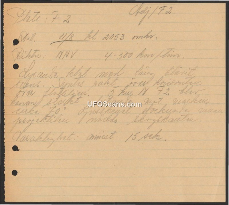 A handwritten report from 2053 detailing a 15-second sighting of a luminous object with a tail, traveling at 400-500 km/h near F2.