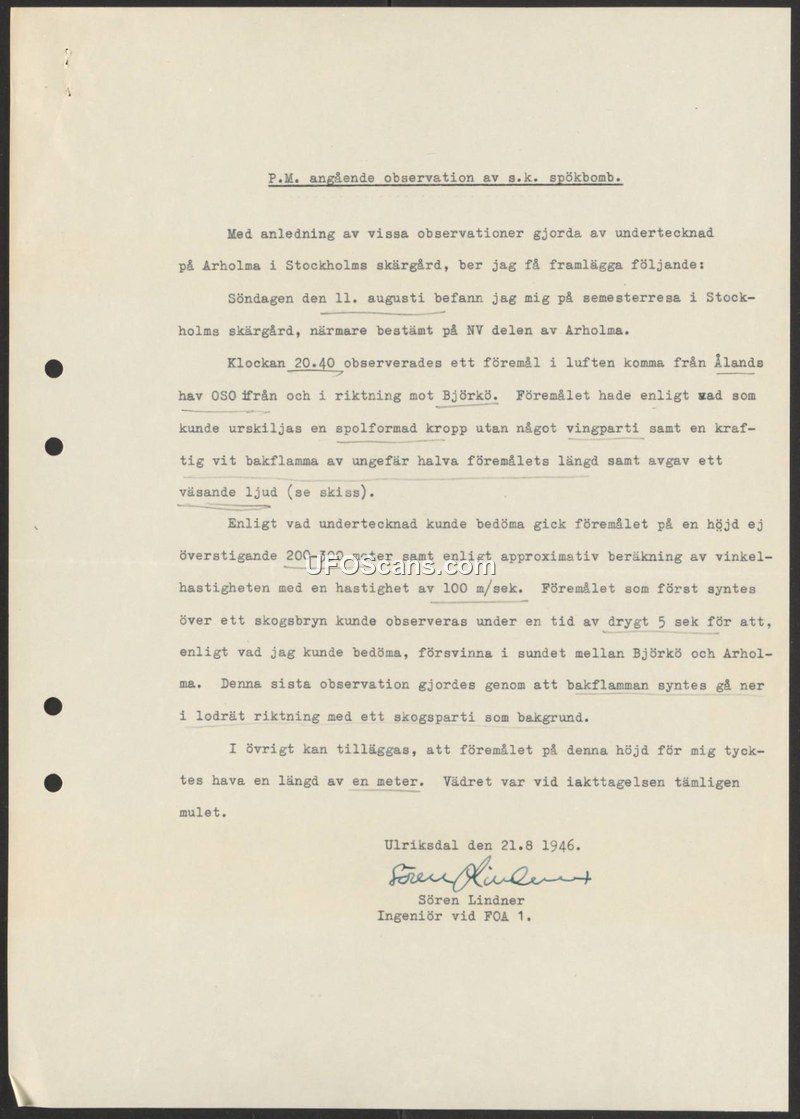 This memorandum, dated August 21, 1946, was authored by Sören Lindner, an engineer at FOA 1, regarding a sighting of a so-called 'ghost bomb' (spökbomb). Lindner reports that on Sunday, August 11, 1946, while on vacation in the Stockholm archipelago on the northwest part of Arholma, he observed an object in the air at 20:40. The object was seen coming from the Åland Sea (Ålands hav) from an east-southeast (OSO) direction, heading toward Björkö. Lindner describes the object as a spindle-shaped body without wings, emitting a strong white flame from the rear that was approximately half the length of the object itself. The object produced a hissing sound. He estimated the object's altitude to be between 200 and 300 meters and calculated its speed at approximately 100 meters per second. The object was observed for slightly over five seconds before it disappeared into the sound between Björkö and Arholma. The final observation was made as the rear flame appeared to descend vertically against a background of trees. Lindner estimated the object's length to be one meter at that altitude. The weather at the time of the observation was described as fairly cloudy.