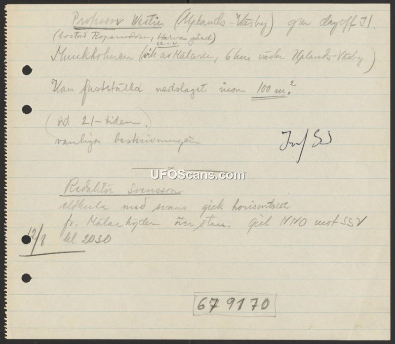 This document is a handwritten field report detailing a sighting in the Uplands-Väsby area of Sweden. The report notes a sighting occurring at 20:30 on August 12th. The primary witness, identified as Redaktör Svensson, described observing a fireball with a tail moving horizontally. The object's trajectory is noted as traveling from Mälarhyden over the city, moving in a direction from NNO (North-North-East) towards SSV (South-South-West). The document also references a Professor Weitin, who resides at Roparudden, Harva gård, in connection with the location. The report includes a reference number, 67 9170, and mentions an ability to determine the impact site within 100 square meters.