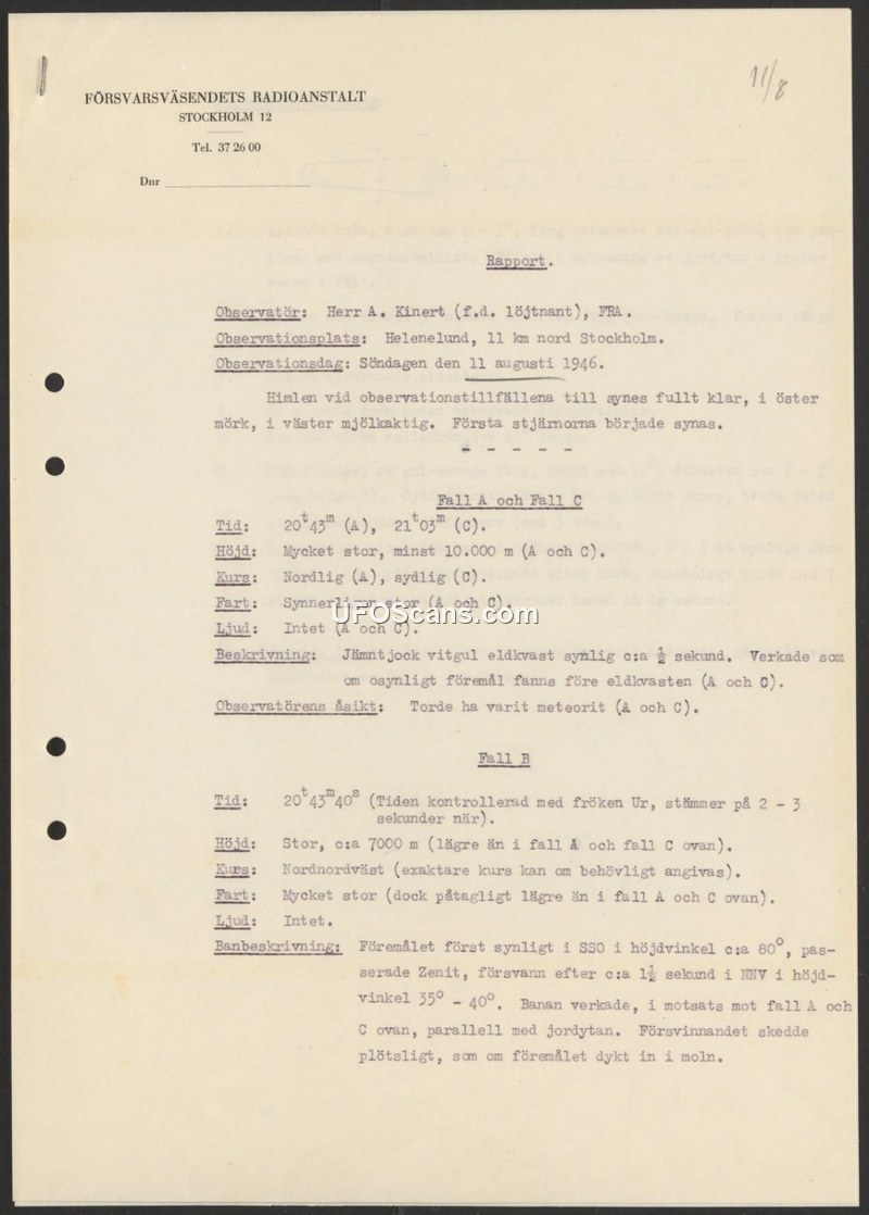 This report, issued by the Swedish National Defence Radio Establishment (FRA), documents three aerial sightings observed by former lieutenant A. Kinert on the evening of August 11, 1946, near Helenelund, north of Stockholm. The sky was reported as clear, with a dark eastern horizon and a milky western horizon. The report categorizes the sightings into three instances: A, B, and C. Instances A and C are described as very large, white-yellow 'fire tails' (eldkvast) observed at an altitude of at least 10,000 meters, lasting approximately 0.5 seconds with no sound. The observer noted that these instances appeared as if an invisible object were preceding the fire tail. Instance B, observed at 20:43:40, was described as a very large object at an altitude of approximately 7,000 meters. This object was first sighted in the south-southeast at an elevation of 80 degrees, passed through the zenith, and disappeared after 1.5 seconds in the north-northwest at an elevation of 35-40 degrees. Unlike the other instances, the flight path of Case B was described as parallel to the ground, and it disappeared suddenly, as if diving into clouds. The observer's conclusion for all three cases was that they were likely meteorites.