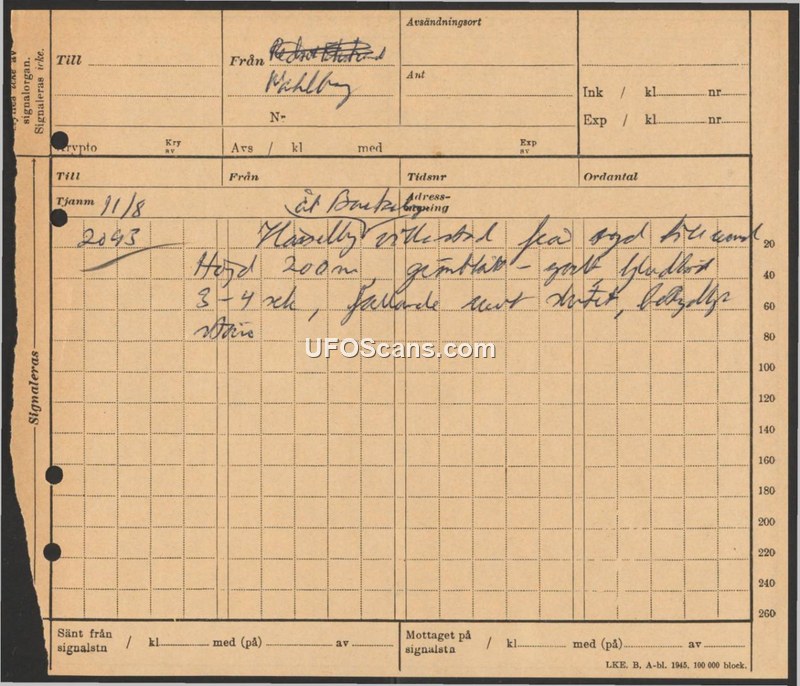 A 1945 telegram reporting the observation of 3-4 dark objects at an altitude of 200 meters. The objects were observed falling.