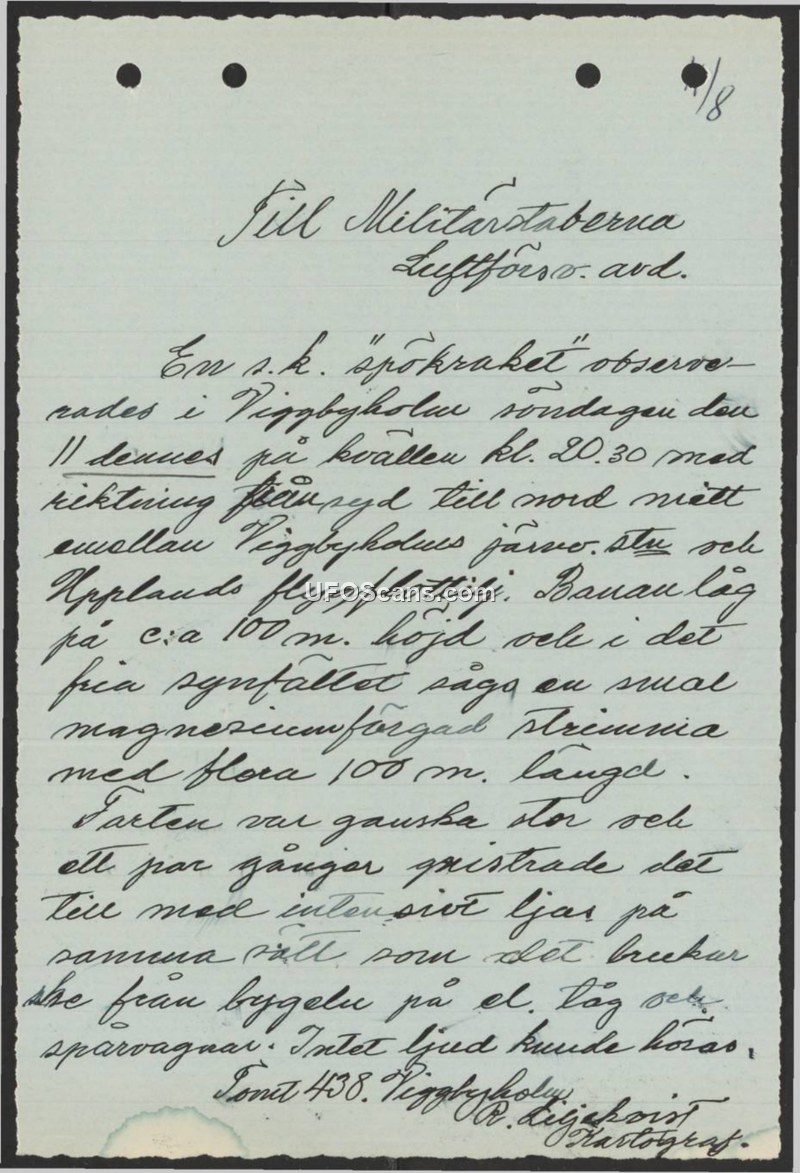 A report to the Swedish Military Staffs describing a 'ghost rocket' sighting in Viggybyholm on the 11th at 20:30. The object was a 100-meter-long, magnesium-colored strip that emitted light similar to electric train sparks.