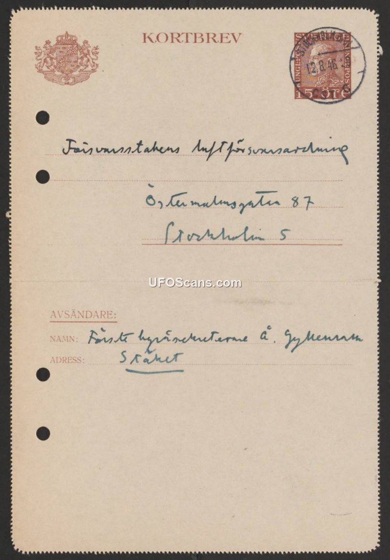 A 1946 Swedish postcard addressed to the Air Defense Department of the Defense Staff by First Bureau Secretary Å. Gyllenram.
